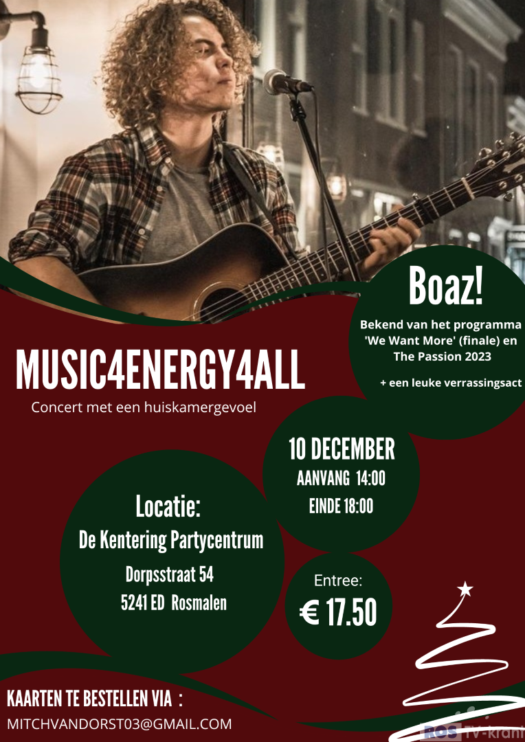 Dit keer een leuke dag met live muziek! Van niemand minder dan Boaz music. Hij stond in de finale van ‘We want more’ en speelde dit jaar in de landelijke Passion! Op 10 december verwelkomen wij hem in de De Kentering Partycentrum te Rosmalen! Ook zal er een leuke verrassingsact aanwezig zijn.
