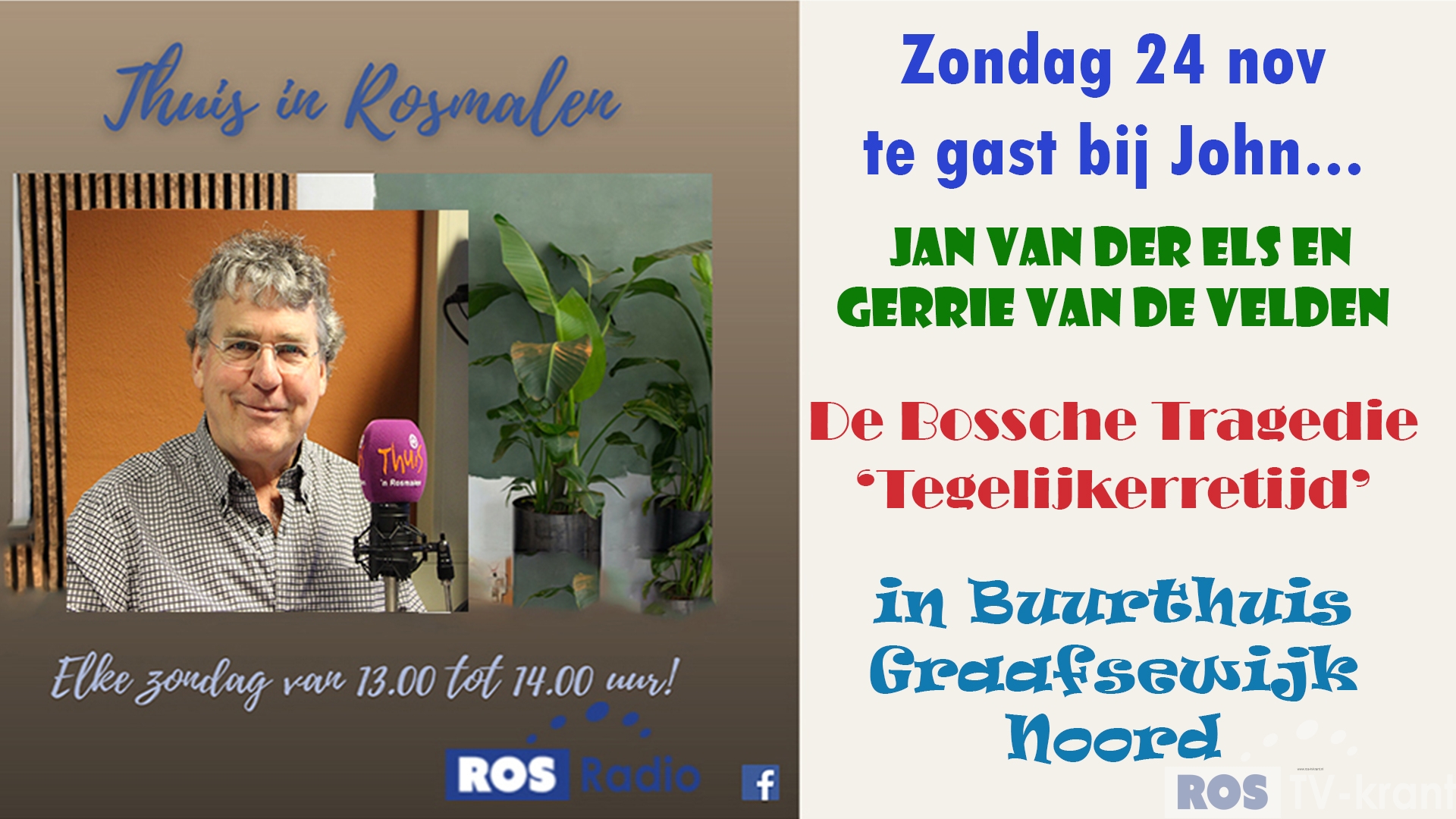 En dat is dan niet omdat uw presentator ruzie heeft met technicus Herman Hubers maar omdat Jan van der Els en Gerrie van de Velden naar de studio komen om te praten over hun theatervoorstelling “Tegelijkerretijd” waarin allerlei Bossche familieperikelen een belangrijke rol spelen.