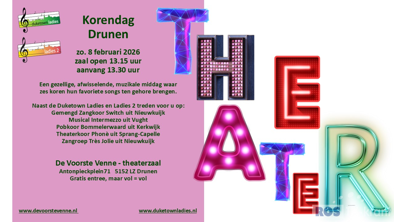Barbershopkoor Duketown Ladies is een van de deelnemers op de Korendag van De Voorste Venne in Drunen (Anton Pieckplein 71, 5152 LZ) op zondag 8 februari. Het programma start om 13.30 uur in de theaterzaal en de Bossche ladies starten om 14.00 uur. Zes regionale koren brengen een gevarieerd programma. De toegang is gratis. Meer info: www.duketownladies.nl en www.devoorstevenne.nl.